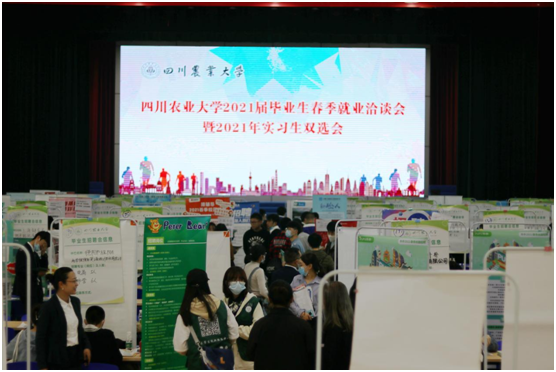 2021届毕业生春季双选会于4月23日上午在都江堰校区体育馆二楼如期举行,凉爽的天气配上各公司人员以及毕业生散发的热情,营造了一种争分夺秒的竞争氛围。上午工作人员全部到位接待用人单位。在双选会现场,部分公司联系学校将他们的公司招聘视频投放到体育馆大屏幕上滚动播放,加大宣传。双选会现场气氛热烈,部分公司面前已经排起了长队。