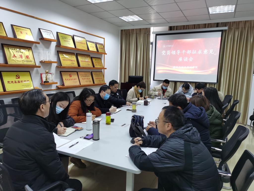 领导班子征求意见座谈会。院领导班子成员、教代会代表、系室负责人、工会代表、青年教师代表等参加此次会议。会议由党委书记申琼主持。