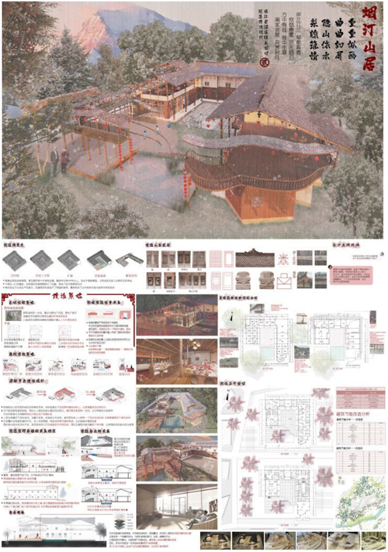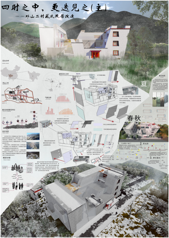 爱国爱农,助力乡村振兴,共建美好家园。钟可盈同学团队以“烟汀山居-通江县泥溪乡梨园坝院落改造”为题,描绘了川东北传统村落保护和更新的美丽蓝图。李雪飞同学团队以“四时之中,更迭见之-川西北藏式民居改造”为题,强调可再生能源(太阳能、风能)在民居室内环境改善设计中的作用,为乡村振兴中的传统村落和民居建设提供了技术支撑。同时也凸显了川农建筑学专业一直以来坚持的办学特色“乡村”、“绿色”,紧扣国家和时代需求,服务乡村,让乡村更美好,成为每一个川农建筑学学子心中的价值观。