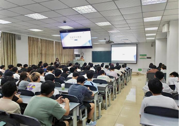 在2A501教室开展建筑专业分享会,建筑学专业老师、各小班班助及84名建筑学2024级新生参会。