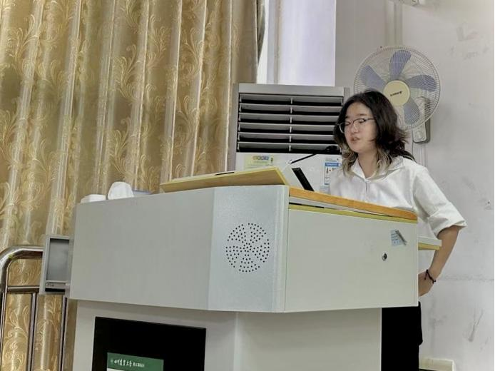 张力文主要介绍班委组织架构和学校组织。她通过生动有趣的语言与同学们亲切互动,活跃现场氛围。她结合自己的班委任职经历,深入浅出地介绍怎样构建一个优秀的班集体。此外,她通过分享优秀学长学姐的荣誉,为同学们树立前进的榜样。