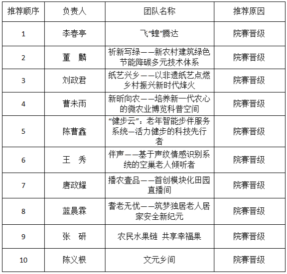 根据学校教务处《关于举办中国国际大学生创新大赛(2024) 91网站 校内选拔赛的通知》要求,经 91网站 中国国际大学生创新大赛(2024)院赛选拔,共计10支项目获得推荐校赛的资格,现将获推项目公示如下: