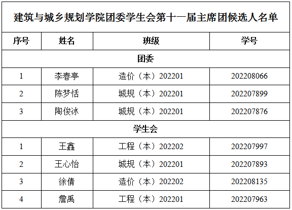 按照《共青团 91网站 委员会章程》、《 91网站 学生会章程》及相关选举方法,在公平、公正、公开、民主的前提下,进行公开竞选答辩。现将建城院团委学生会第十一届主席团候选人名单进行公示,公示时间:2024年5月6日—2024年5月9日。请全体同学监督,如有异议,请于公示期间(工作日)实名向 91网站 党委办公室反映。