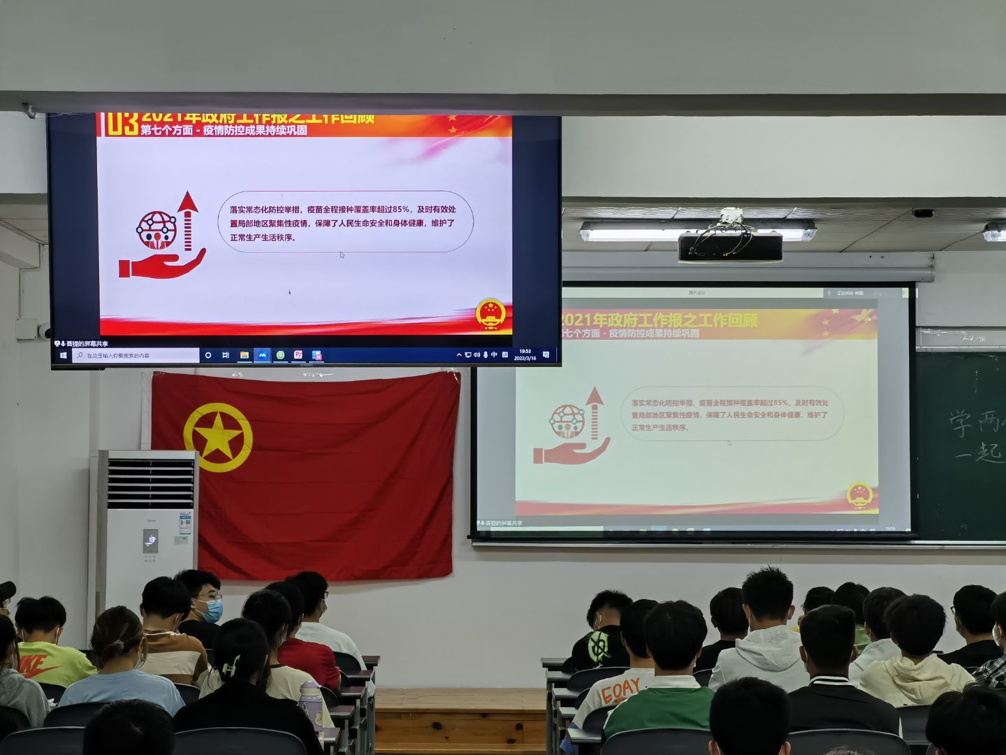 符宇航副院长线上为大家分享感悟。通过分享,同学们更加了解两会的内容及其重要性,更加坚定走人民民主专政的道路,始终坚持党的领导。此外,同学们还就“考研还是就业”这一两会热点话题展开了激烈讨论,现场激情四溢,掌声雷动。
