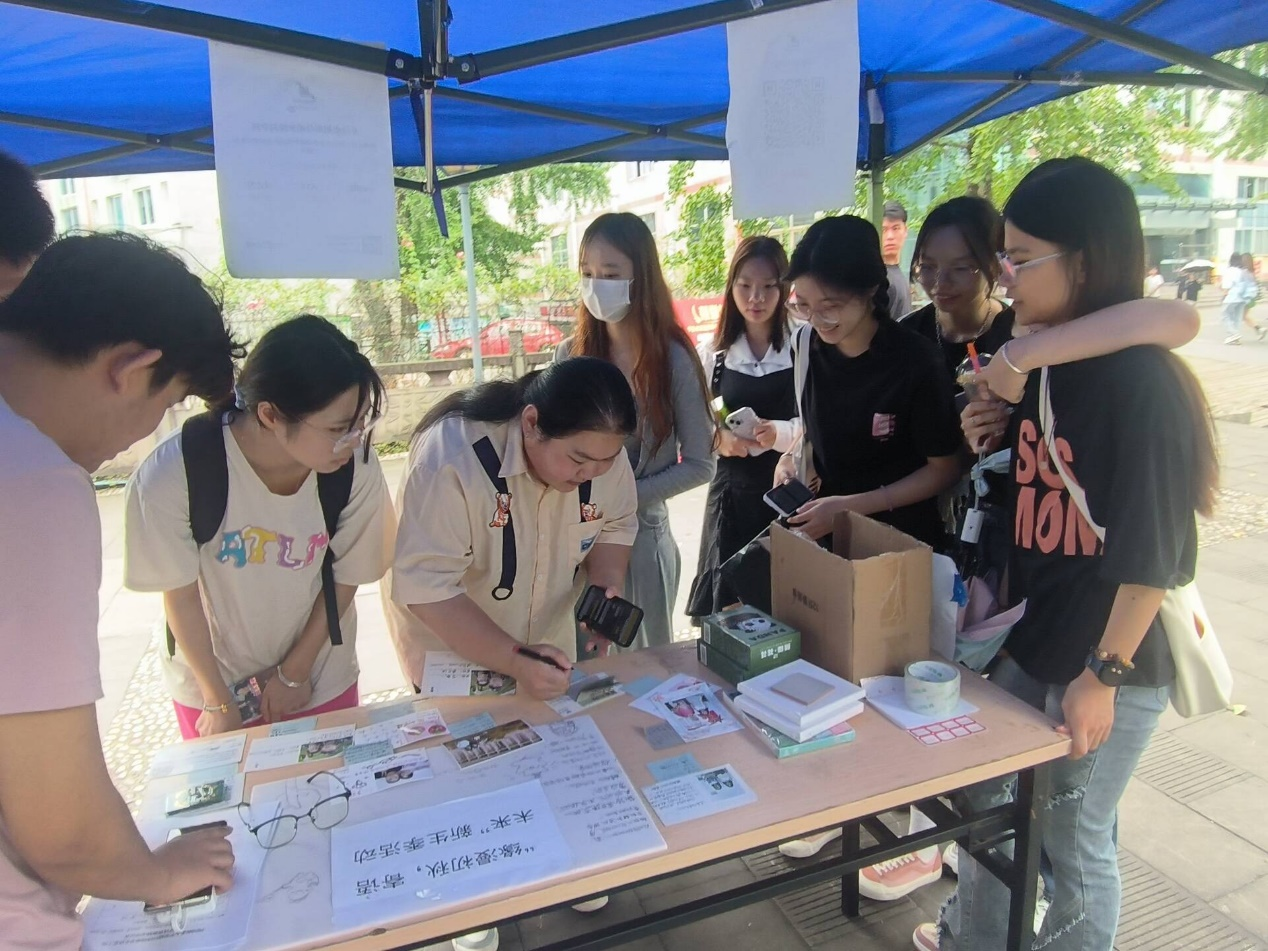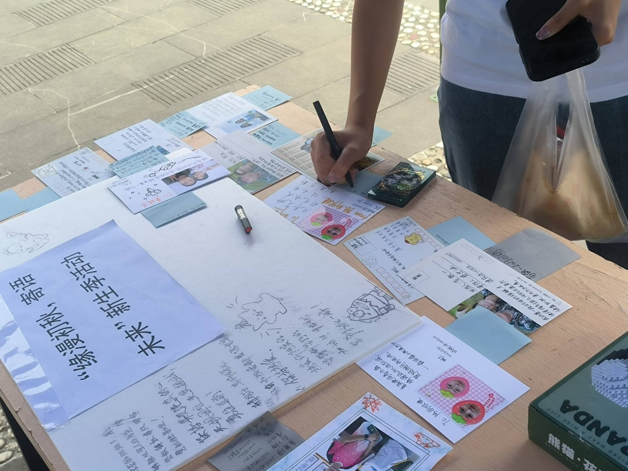 而新老生共同参与的合照明信片活动更是受到了同学们的广泛参与和一致好评。同学们进行不同组合的合照,并将合照贴于明信片上,记录下想对他们表达却羞于当面说出的言语。随后同学们还可以通过投票,选出自己最喜欢的明信片。明信片最终将被赠予到老师或同学手中,搭建起沟通情感的纽带与桥梁,传递祝福与温暖。“好感动,来学校之前我很忐忑,害怕陌生的环境和同学,可是没想到开学不久就有同学来找我拍合照做明信片,现在我更加期待在大学里的生活了。“新生陈丽欣婕兴奋地说。最后,同学们执起笔,在寄语墙上写下了对老师同学的祝福和对自己的劝诫与未来的展望。
