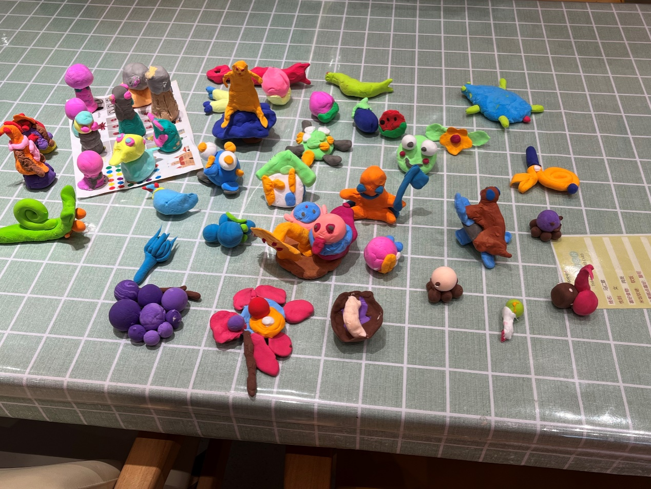 “我们先来捏一个小动物吧,比如一只可爱的小猫咪。”杨同学动手示范各个步骤,黄色的黏土从扁平到立体,从雏形到形象。奶奶看得入迷,在协助下动手尝试。在志愿者的耐心指导下,她的手法从生疏到逐渐掌握技巧,创作出一个个形态各异、憨态可掬的作品。